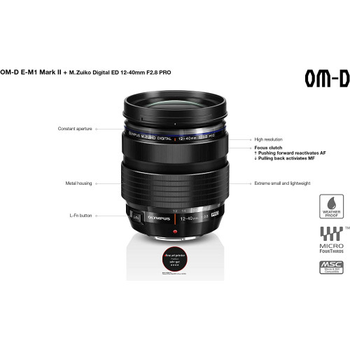 1 x cuerpo de cámara (Negro), 1 x cargador de batería BCH‑1, 1 x baterías recargables de ión‑litio BLH‑1 , 1 x CB‑USB11, 1 x cable USB CC‑1 Clip con cable, 1 x correa bandolera, 1 x FL‑LM3 flash, 1 x instrucciones de uso, 1 x tapa cuerpo del Micro Cuatro Tercios (BC‑2), 1 x tarjeta de garantía, 1 x M.Zuiko Digital 12-40 mm PRO