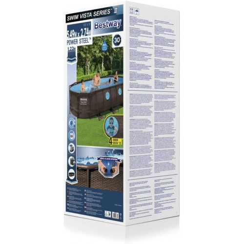 - Incluye – Piscina desmontable ovalada Power Steel de Bestway 549 x 274 x 122 cm, depuradora de cartucho 5.678 L/H, 1 escalera, 1 cobertor, 1 dispensador de cloro y 1 parche de reparación autoadhesivo