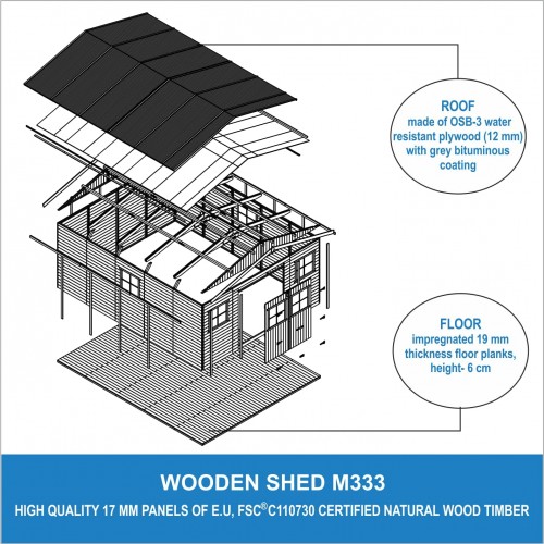 - Piso de cobertizo incluido (alto 6 cm): Tablones de madera - el espesor 19 mm;
