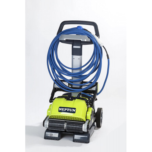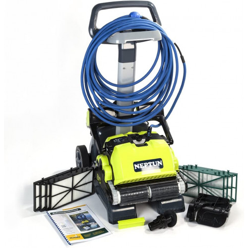 El robot de piscina Neptun ha sido desarrollado específicamente para la limpieza de piscinas públicas, privadas y naturales, teniendo como objetivo superar los límites de los robots de piscinas existentes. El primer límite que había que superar era el reducido tamaño de las bolsas de filtro que tienen los robots, así que Neptun ha sido provisto con tres cartuchos de filtro con diferentes medidas cada uno (50/100/200 μ). Al adoptar esta innovación, la limpieza y el reemplazo de filtros se simplifica. El robot para limpieza de piscinas Neptun se adapta a todas las superficies, y es capaz de eliminar cualquier tipo de suciedad o residuo de su piscina. Su diseño está concebido para uso profesional, pero su fácil sistema lo hace accesible para uso particular también. Si quiere la máxima limpieza en su piscina, sin esfuerzo y con garantía de que se pueda adaptar a cualquier circunstancia y superficie, no lo dude, y opte por la más alta tecnología y calidad, robot Neptun.