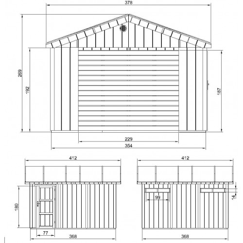 - Dimensiones exteriores sin el techo: 354 x 368 cm