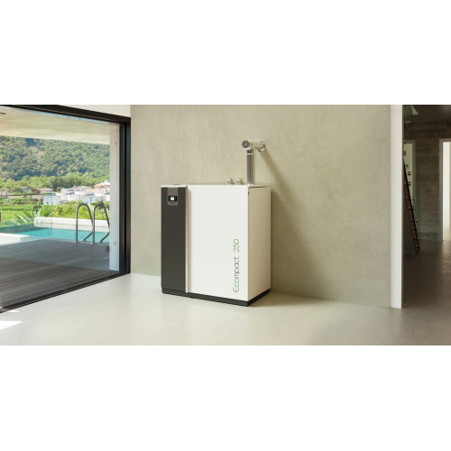 Calentador de pellets sólido, seguro, inteligente y certificado. ECompact 250 y 290 son calderas de pellets con sólido revestimiento de acero, aislamiento de vermiculita y fibra de vidrio con juntas herméticas que, además de garantizar una mayor seguridad y eficiencia de combustión, permite la instalación de los aparatos en hogares de clase energética y aislamiento de última generación para optimizar los costes en el calentamiento. La presencia de la bujía de cuarzo permite obtener encendidos hasta seis veces más rápido que la tradicional, lo que garantiza una vida útil más larga y un menor consumo de energía. Con sonda K que garantiza un control óptimo e inmediato de la llama, reduciendo los tiempos de encendido. La tarjeta electrónica de última generación ofrece un control total, eficiencia y seguridad del dispositivo, mientras que el programador semanal se puede utilizar para configurar hasta 4 encendidos y apagados diarios y optimizar así el funcionamiento durante todo el día