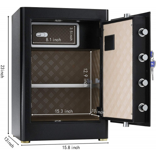 - 【 Interior】: el gran espacio interior te permite cargar casi todos tus objetos de valor incluyendo portátil de 14'', pistola, joyas, documentos, dinero en efectivo y más. Los estantes extraíbles te ayudan a organizar tus cosas importantes fácilmente. La caja de cierre interior añade una protección adicional para tu privacidad. Las suaves capas interiores evitan que tus pertenencias no cambien de arañazos o daños.