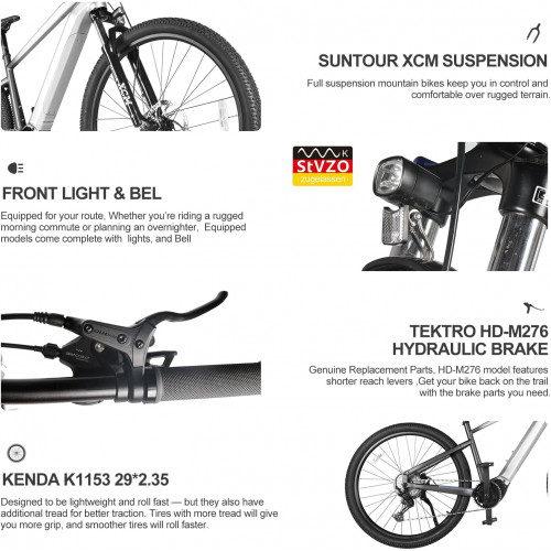 - 【Freno de Disco Hidráulico y Sistema de Transmisión】Los frenos de disco hidráulicos TEKTRO y los pedales de aluminio robustos ofrecen una respuesta rápida y una conducción más segura. Los engranajes profesionales Shimano de 11 velocidades hacen que todo el sistema de transmisión sea suave y duradero. La horquilla de suspensión bloqueable SUNTOUR XCM es ajustable para adaptarse a diferentes condiciones de la carretera.