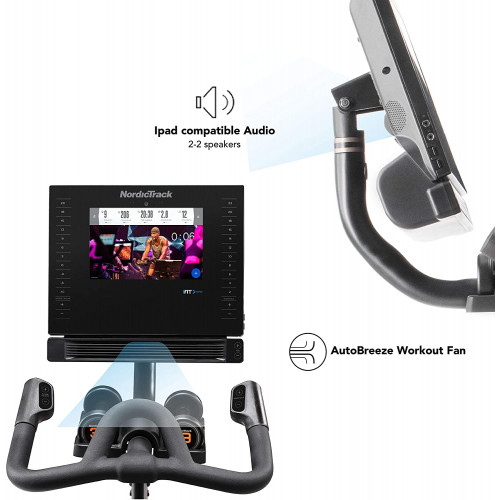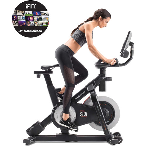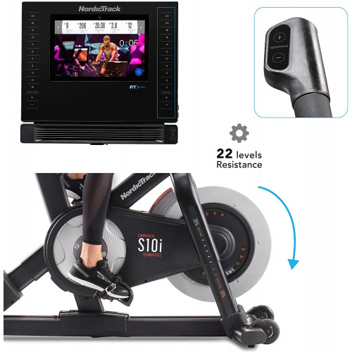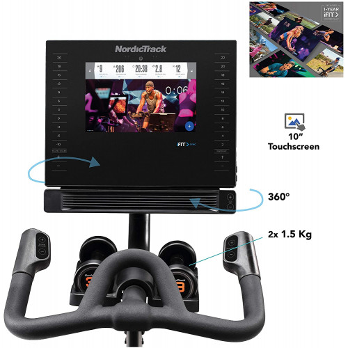 Características de la bicicleta estática Commercial S10i Studio Cycle de NordicTrack: con la bicicleta Commercial S10i de NordicTrack, ahora puedes disfrutar del cross training desde casa y con tu propio entrenador personal. Esta bicicleta de diseño innovador será tu aliado perfecto para lograr un entrenamiento con resultados óptimos. Touch Control de -10 a 20 %: con solo apretar un botón, la bicicleta ajusta al momento la declinación o inclinación de -10 a 20 %. Ventilador Autobreeze: el ventilador ajusta su potencia de forma automática en función de la velocidad de la bicicleta y también puedes seleccionar la intensidad en el panel de control. 1-Touch Resistance Control: con solo apretar un botón, la bicicleta Commercial S10i ajusta al momento la resistencia (24 niveles) para aumentar la dificultad y aportar variedad a los entrenamientos. La pantalla táctil HD en color de 10 pulgadas se puede girar e indica la velocidad, la inclinación, la distancia, las pulsaciones, el tiempo y las calorías. Portabotellas: tendrás la botella de agua a mano durante tus sesiones de cardio para mantener una hidratación adecuada. Sillín y manillar ajustables: el sillín de la bicicleta Commercial S10i Studio Cycle es ajustable y flexible; su manillar también es ajustable para garantizar la comodidad en tus sesiones de entrenamiento. iFit integrado: accede a numerosos programas de entrenamiento (vídeos de entrenamiento) y practica tus sesiones deportivas por todo el mundo o en gimnasio. La bicicleta sincroniza el desnivel y la resistencia en función del recorrido y las indicaciones de tu entrenador (suscripción de 1 año incluida). Ahora puedes personalizar tu propio programa de fitness, disfrutar de sesiones de entrenamiento automáticas y gestionar tu perfil en línea. Pulsaciones cardíacas con el sistema de electrocardiograma (contacto de las manos con los sensores) o mediante cinturón con bluetooth (no incluido), y pesas incluidas.