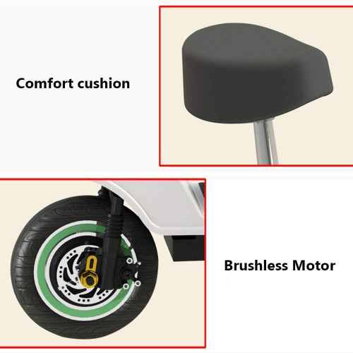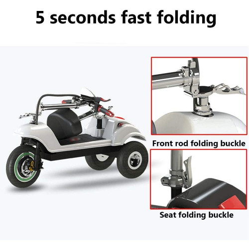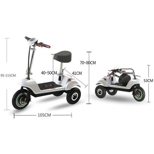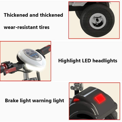 - Bicicleta eléctrica de 3 ruedas con motor sin escobillas, batería de litio de 36 V/10 A, peso de aproximadamente 25 kg, potencia de 350 W, rango de crucero de aproximadamente 30-40 km, velocidad máxima de 35 km/h, frenos de disco delanteros y traseros, control de 3a velocidad, y con marcha atrás