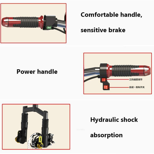 - Mango cómodo, freno sensible; Cambio de 3 velocidades, mano cómoda; absorción de impactos hidráulica, buen efecto; llantas de goma gruesas, inflables resistentes al desgaste; faros LED de alto brillo con intermitentes; luces de advertencia de freno, la conducción nocturna es más segura; Frenos de doble disco delanteros y traseros, freno de seguridad; pedal antideslizante, sillín cómodo; motor sin escobillas, buena estabilidad
