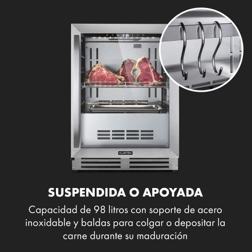 Colgado o reposado: 98 litros de espacio interior para madurar la carne colgada del gancho de acero inoxidable o encima de la estantería de acero inoxidable