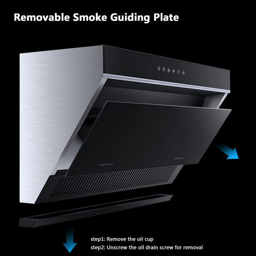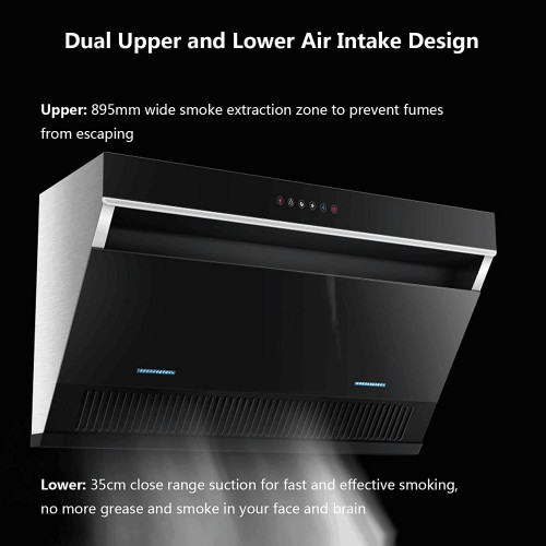 • DISEÑO DE DOBLE ENTRADA DE AIRE: área de recolección de humo de 895 mm de ancho arriba para evitar que escapen los humos. Lo siguiente cerca de 35 cm cerca de la velocidad de succión, fumar rápido más efectivo, de ahora en adelante despídete del humo de grasa que cubre la cara del problema.
