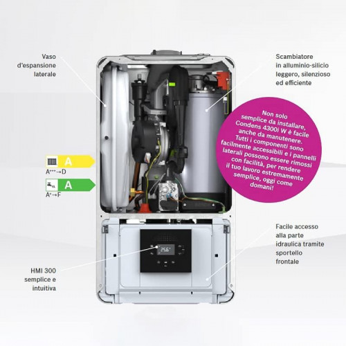 - Alta eficiencia: los materiales de primera elección utilizados para Condens 4300i W la hacen extremadamente robusta, fiable y duradera. Además, el Condens 4300i W garantiza una alta eficiencia, ya que adapta su funcionamiento de acuerdo con la demanda real de calor, reduciendo así los costos de energía.