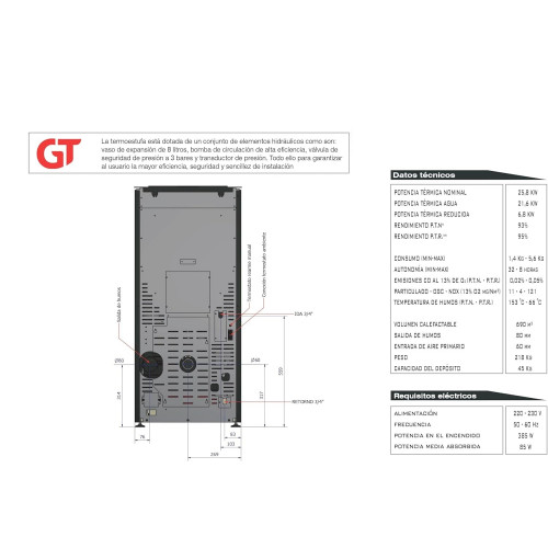 - Amplio rango de temperatura: La termoestufa puede alcanzar temperaturas de humos de entre 123°C y 54°C, brindando un calentamiento adecuado y seguro.