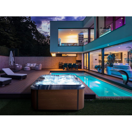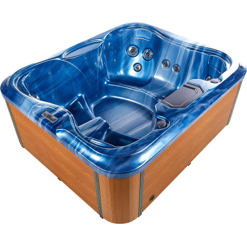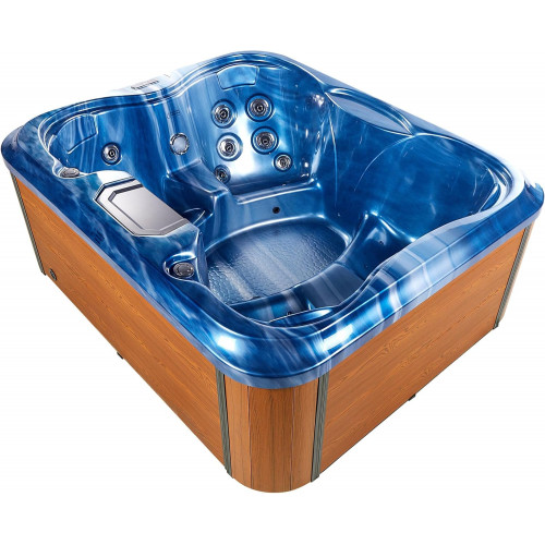 Bañera de hidromasaje LED de acrílico azul madera clara 180 x 215 cm aluminio 4 plazas 19 jets aire libre Arcelia