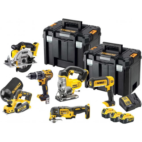 • DCD796 Taladro combinado de 2 velocidades sin escobillas, DCP580 cepilladora sin escobillas, sierra circular DCS391, multiherramienta oscilante sin escobillas DCS355, sierra de calar DCS331, luz inalámbrica DCL050, cargador multivoltaje DCB115, 2 x DWST1-71195 profundo Cajas de T-StakakBoxes, 3 baterías DCB184 de 18 V 5.0 Ah XR de iones de litio, bolsa de cepillado DWV9390