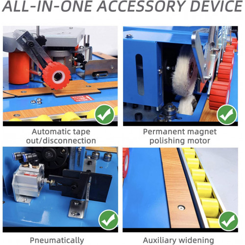 [Máquina multifuncional de bandas de borde para carpintería] Tipo de banda de borde: borde curvo / borde recto / borde con forma, completamente automático, velocidad ajustable, calentamiento rápido, control inteligente de temperatura, máquina todo en uno para recortar, pulir y bandas de borde.