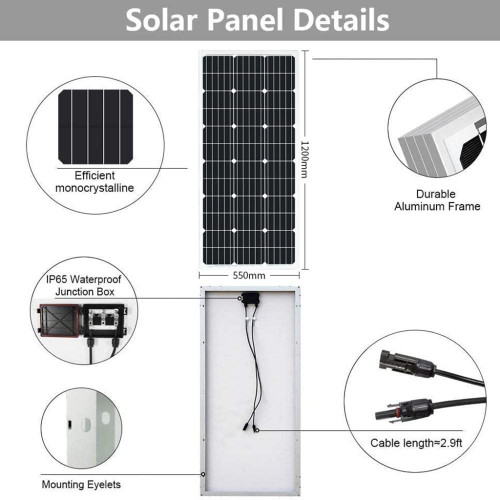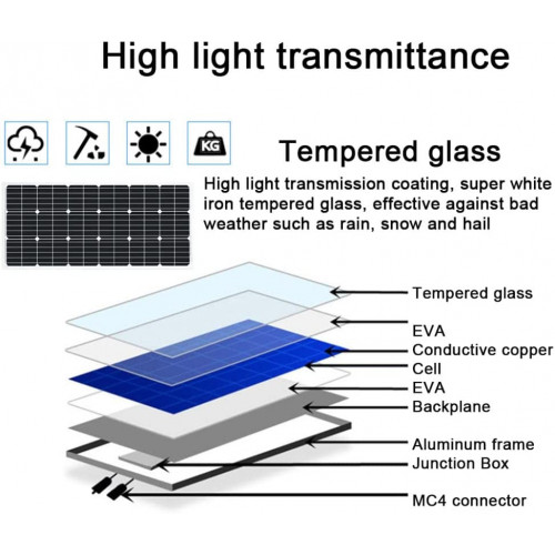 5 paneles solares: paneles solares monocristalinos de 100w, la eficiencia de conversión puede alcanzar el 22,9%, incluso en entornos con poca luz también tiene un excelente rendimiento. El vidrio en el está hecho de alta dureza, alta transmisión de luz, resistencia a altas temperaturas, capa de vidrio solar de vidrio completamente templado.