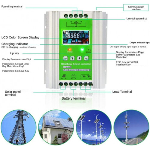 Detección de teléfonos móviles: el controlador de carga híbrido eólico y solar de 12/24/48 V coincide automáticamente con la energía eólica de 0-300 W y los sistemas solares de 0-500 W. Se puede monitorear en tiempo real conectando un teléfono móvil a través de WiFi, y la carga de la turbina eólica adopta la tecnología MPPT, por lo que la energía de la turbina eólica aún se puede usar a bajas velocidades del viento.
