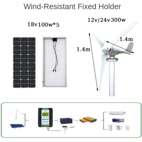 Conversión eficiente de paneles solares, paneles solares de silicio monocristalino, chips fotosensibles integrados. El vidrio templado puede soportar un alto impacto y resistir eficazmente el mal tiempo, como la lluvia, la nieve y el granizo. Inversor de 1000 W, puede convertir DC12v/24V a AC 110V/220V/240V. Controlador de carga híbrido eólico-solar, Coincidencia automática de 12/24/48 V Energía eólica de 0-300 W, sistema solar de 0-500 W. Generador de turbina eólica de 300 W, 3, 1,4 m de diámetro, alta utilización de energía eólica, peso ligero y bajo. Móvil detección de teléfono, el voltaje se puede monitorear conectando el teléfono móvil a través de WiFi. br/>Voltaje de funcionamiento: 12V/24V/110v/220V Peso del panel solar: 40 kg Peso del molino de viento: 10kg Tamaño del panel solar: 1200*550*30mm Tamaño del inversor : 305*14 6*66 mm Temperatura de trabajo: -40°℃-80°℃ Paquete incluido: 5* 100W panel solar monocristalino 1*1000W inversor aislado 1* cable solar 1* turbina eólica de 300W 1*controlador de carga híbrido de 800w