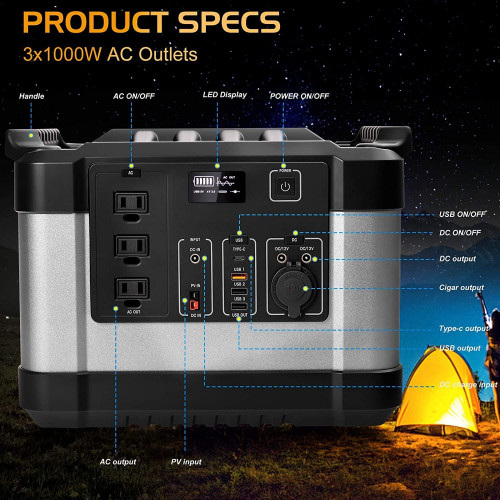 【Salidas multifuncionales】- 9 salidas de alimentación portátiles, lo que le permite cargar hasta 9 dispositivos al mismo tiempo. La fuente de alimentación del generador para exteriores impulsa 1000 vatios nominales y 2000 vatios pico, tiene: 3 salidas de CA, 1 entrada de PV, 1 USB ON/OFF, 1DC ON/OFF, 1 salida de CC, 1 salida de cigarro, 1 salida tipo c, 1 salida USB, 1 entrada de carga de CC para alimentar muchos dispositivos.