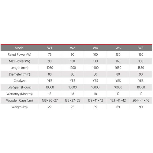 Modelo: W8, 150-180W L: 1850 mm Dia.80mm El producto se presenta como un tamaño pequeño y un buen modelo