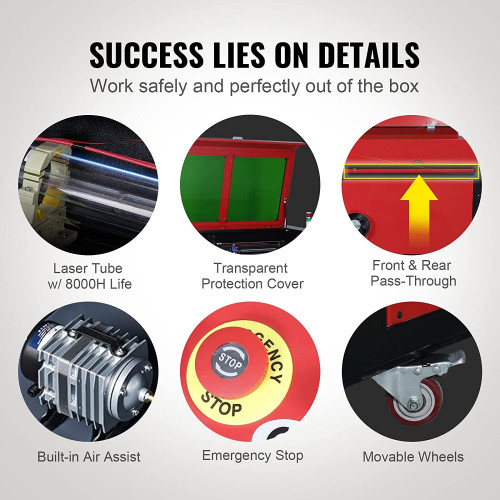 Operación fácil y segura: La ventana de visualización transparente con protección ocular tintada le permite monitorear el progreso del grabado en cualquier momento y puede cortar automáticamente la energía cuando se abre. Una parada de emergencia está lista en caso de que algo salga mal. Nuestro grabador láser también tiene una asistencia de aire incorporada para eliminar todo el humo, el polvo y las chispas, y las ruedas móviles facilitan el movimiento.