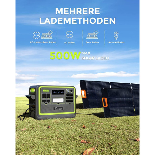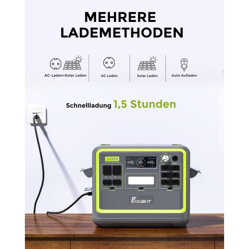 - Carga del 0% al 80% en 1 hora: con la tecnología de carga rápida FOSSiBOT, el F2400 se puede cargar de 0 a 80% en 1 hora, completamente cargado en solo 1,5 horas (1100 W CA + 500 W panel solar). Una carga de dos horas con 1100 W CA solo es suficiente para cargar completamente el dispositivo.
