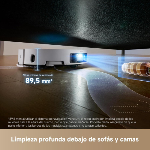 - Limpieza mejorada de espacios reducidos y abiertos - Gracias al sistema de navegación VersaLift, podrás disfrutar de una limpieza completa tanto debajo de muebles bajos como en espacios abiertos. El robot aspirador L50 Pro Ultra puede descender hasta 89,5 mm, lo que permite una navegación fluida debajo de sofás y camas, mientras que su sensor de elevación ofrece una visión versátil en espacios abiertos.