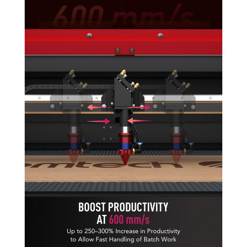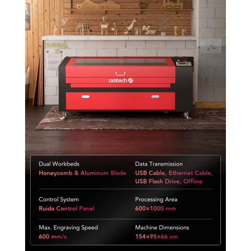 • Maneja con Facilidad: El grabador láser de CO2 de 100W de OMTech graba hasta una profundidad de 10 mm en diversos materiales no metálicos como madera, vidrio, acrílico, cuero y más. Con velocidades de hasta 600 mm/s, transforma tus visiones artísticas en realidades que sorprenden y cautivan. Las camas con panal de abeja y hoja de aluminio están diseñadas para ofrecer un amplio área de trabajo de 600x1000 mm, lo que permite realizar una amplia gama de proyectos.