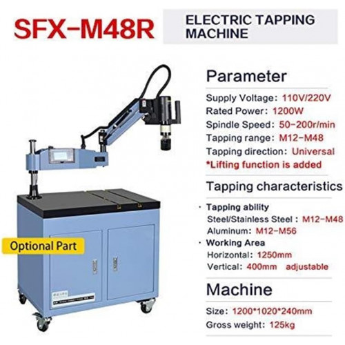 • Introducción: Las máquinas de roscar eléctricas pueden mejorar enormemente la productividad en la fabricación de piezas con una gran cantidad de orificios roscados. Adecuado for roscado M12-M48. Tensión de alimentación: 220V. Potencia nominal: 1200W. Velocidad: 50-200r/min. Radio de trabajo: 1180 mm. Tamaño: 47,2*40,2*9,45 pulgadas. Peso: 275,6 libras.