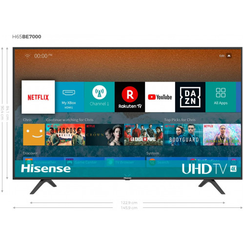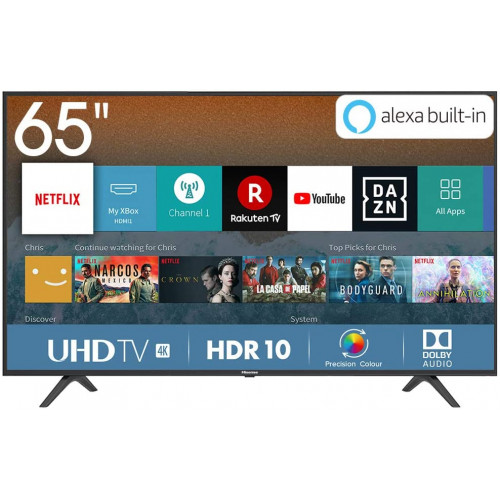 Hisense H65BE7000 - Smart TV 65' con Alexa Integrada, 4K Ultra HD, 3 HDMI, 2 USB, salida óptica y de auriculares, Wifi, HDR, Dolby DTS, Procesador Quad Core, VIDAA U 3.0 con IA [Clase de eficiencia energética A+]