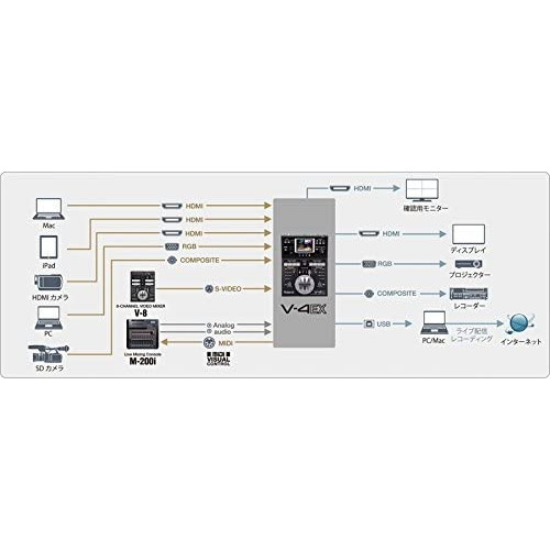 Con estas características y funciones, el V-4EX se basa en el impresionante conjunto de características, incluyendo los efectos integrados y la interfaz de usuario, que han hecho del V-4 uno de los mezcladores de vídeo más vendidos de todos los tiempos.
