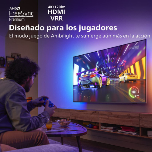 • EXCELENTE PARA VIDEOJUEGOS: Este televisor inteligente y delgado cuenta con un modo de baja latencia automático y compatibilidad con HDMI VRR y HGIG para un juego súper receptivo y ultra fluido, mientras que el modo de juego de Ambilight te transporta directamente a la acción.