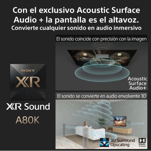 - Audio envolvente: La pantalla es el altavoz; acoustic Surface Audio+ combina tres actuadores, así como dos subwoofers, para crear un sonido envolvente que se mueve con la imagen, con diálogos claros y reales, y graves potentes