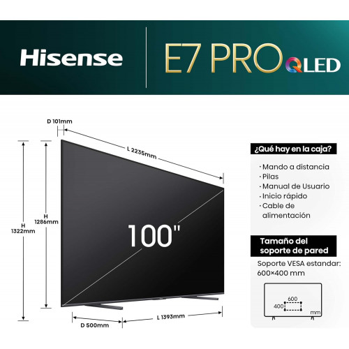 Hisense 100E7NQ Pro - QLED Gaming TV, 100 Pulgadas Televisor, VRR 144Hz HSR 240 fps, AMD Freesync Premium Pro, Barra de Juegos, Solución HDR Total, Dolby Vision IQ & Dolby Atmos Nuevo 2024