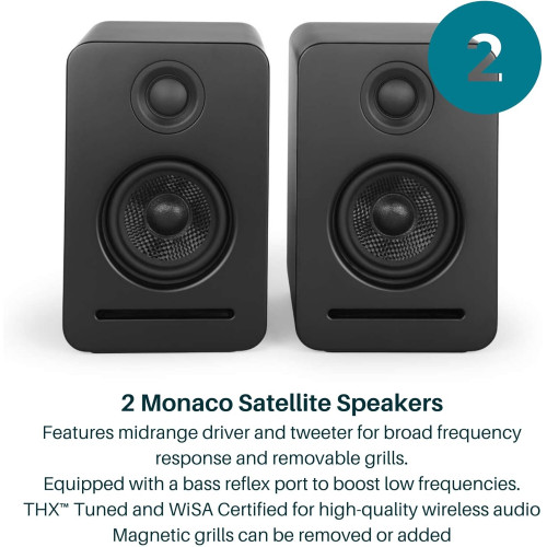 - Configuración sencilla: conecta los altavoces y el transmisor WiSA SoundSend (incluido) a tomas de corriente y conecta SoundSend a tu Smart TV. SoundSend se conecta automáticamente a tus altavoces Mónaco. El diseño compacto facilita la colocación del altavoz, y el subwoofer de perfil bajo cabe debajo de muchos sofás.