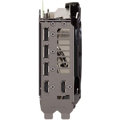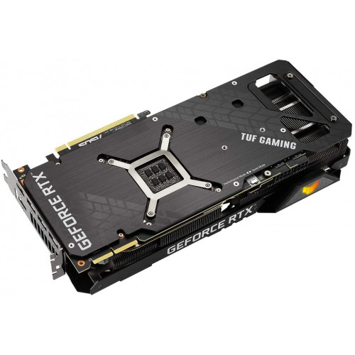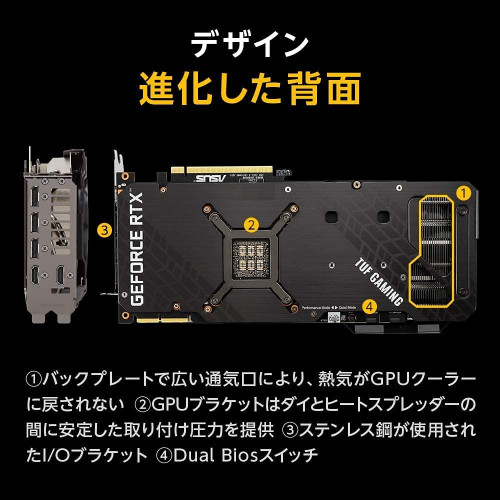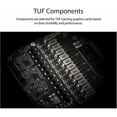 Diseño de 2,7 ranurasEl difusor de calor concentra el calor en unos caloductos que lo transportan a una matriz de aletas que se extiende a lo largo del perfil de 2,7 ranuras. Esta generación de tarjetas gráficas TUF Gaming también cuenta con un disipador para la la VRAM que mantiene a raya la temperatura de la memoria. | Componentes TUFSeleccionamos los componentes de las tarjetas gráficas de TUF Gaming en base a su durabilidad y rendimiento. Los componentes se sueldan a la PCB con nuestro avanzado proceso de fabricación automatizada Auto-Extreme. Los puntos de soldadura suaves en la parte posterior y la eliminación de errores humanos asegura que todas nuestras tarjetas gráficas cumplan con las rigurosas especificaciones de ROG. Por último, las gráficas se someten a una validación compuesta por 144 horas de exigentes pruebas. | Mejoras en la parte traseraLa parte trasera de la tarjeta revela una serie de mejoras. La placa protectora de metal cuenta con un orificio deventilación que permite que el aire caliente escape hacia los extractores del chasis, en lugar de reciclarse con el aire frío. Debajo de la GPU, un soporte refuerza la conexión crítica entre la GPU y el difusor. El soporte de conexiones de acero inoxidable protege los puertos al tiempo que proporciona un proceso de montaje más seguro. Y el interruptor Dual Bios permite seleccionar los modos rendimiento y silencio sin tener que recurrir al software. |