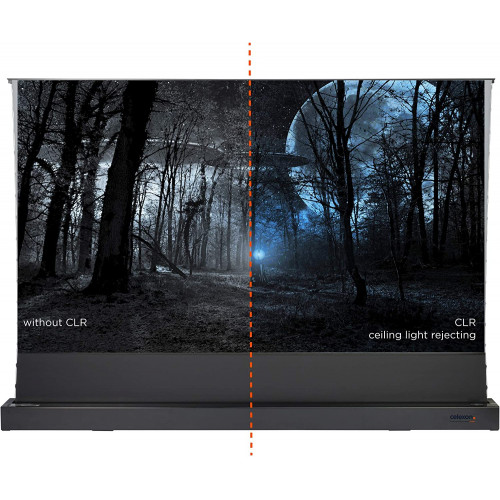La pantalla de contraste motorizada de suelo CLR HomeCinema UST de celexon, en combinación con un moderno proyector de distancia ultracorta, es un verdadero sustituto de la televisión de pantalla grande. Gracias a la innovadora tela de la pantalla de proyección de contraste de 8K de celexon (conocida como pantalla CLR HomeCinema UST de celexon) y a la inteligente construcción con articulación de tijera eléctrica, es posible obtener fácilmente una imagen grande en casi cualquier habitación. La gracia aquí proviene de que cuando no se está utilizando, la superficie de la pantalla desaparece casi por completo de la vista ya que la pantalla no tiene que ser montada en la pared o el techo, sino que desaparece dentro o detrás de un tablero bajo. Esto crea el sueño de un televisor enrollable de 100-120", que sólo es visible cuando está en uso.