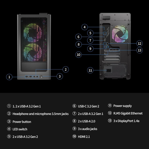 - Arquitectura térmica ARGB: diseñada a medida para un rendimiento silencioso con refrigeración por aire de triple ventilador y un enfriador de 150 W, además de ventilación de malla frontal para un flujo de aire óptimo. El panel lateral de vidrio sin herramientas resalta la iluminación RGB interna y crea una plataforma de juego visualmente impresionante